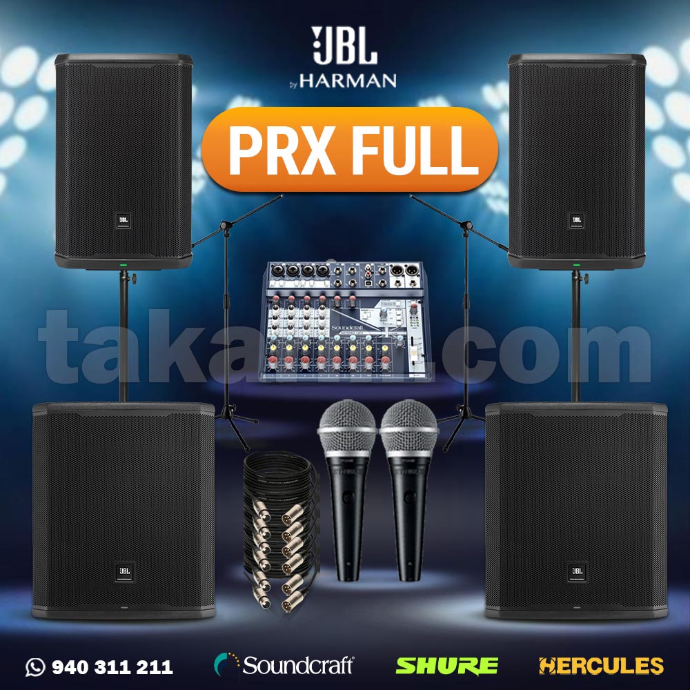 Combo de Audio Profesional todo incluido: Parlantes Activos de marca JBL serie PRX 900 que incluye 4 parlantes: 2 PRX 915, 2 PRX 918XLF con potencia total: 8,000 Watts, además: 1 mezcladora Soundcraft Notepad 12FX, 2 micrófonos Shure PGA48, atriles Hércules y cables respectivos.